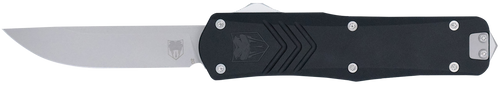 The Cobratec FS-3 is a medium-sized out-of-the-front (OTF) knife featuring a 3" drop point blade made from D2 steel with a plain edge. It has a 4.5" gray aluminum alloy handle and an overall length of 8", weighing 6.30 oz, making it suitable for general utility and tactical applications.