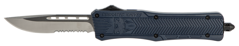 This is a medium-sized out-the-front (OTF) knife featuring a 3" drop point blade made from D2 steel with partial serration. The NYPD blue aluminum handle includes a glass breaker and pocket clip, with an overall length of 8" and weight of 4.50 oz.