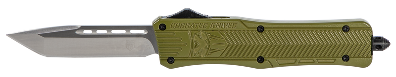 The Cobratec CTK-1 is a medium-sized out-of-the-front (OTF) folding knife featuring a 3" D2 steel tanto blade with a plain edge and OD green aluminum handle. The knife includes a glass breaker and comes with a pocket clip for carry convenience, with an overall length of 8" when deployed.