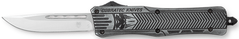 The Cobratec CTK-1 is an automatic out-the-front (OTF) knife featuring a 3" stonewashed D2 steel drop point blade and black aluminum alloy handle. The knife has an overall length of 8" and includes a nylon sheath, plus a glass breaker feature for emergency situations.
