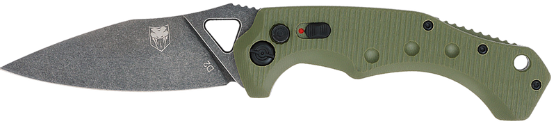 The Cobratec Ryker is an automatic folding knife featuring a 3.75" D2 steel drop point blade with a plain edge and black stonewashed finish. The knife has an overall length of 8.75" when open and is constructed with an OD green textured G10 handle, weighing 5.90 oz with a manual safety and side button deployment.