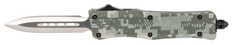 The Cobratec CTK-1 is a small out-the-front (OTF) dagger knife featuring a 2.75" plain edge D2 steel blade with a winter digital camouflage aluminum handle. The knife includes a glass breaker feature and comes with a pocket clip for convenient carry. Overall length is 7" when deployed, with a total weight of 4.50 oz.