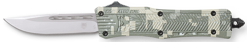 This CobraTec CTK-1 is a compact OTF (out-the-front) folding knife featuring a 2.75" drop point blade made from D2 steel with a plain edge. The 4.25" digital camo aluminum alloy handle includes a button-open mechanism and comes with a nylon sheath for carry and storage.
