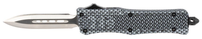 The Cobratec CTK-1 is a small out-of-the-front (OTF) dagger knife featuring a 2.75" plain edge D2 steel blade and carbon fiber aluminum handle. It includes a glass breaker and pocket clip, with an overall length of 7" when fully extended. The knife comes with a nylon sheath and weighs 4.50 oz.