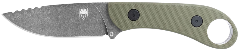 The Cobratec Skinner Gen II is a 7.75" overall fixed blade knife featuring a 3.50" stonewashed D2 steel blade with a plain edge and full tang construction. The handle is crafted from OD Green textured G10 scales with an integrated finger ring, and the knife comes with a Kydex sheath for secure carry and storage.