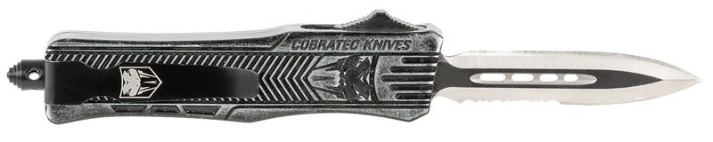 The Cobratec CTK-1 is a small out-the-front (OTF) dagger knife featuring a 2.75" part-serrated D2 steel blade with a stonewashed aluminum handle. It includes a glass breaker and pocket clip, with an overall length of 7". This trigger-activated OTF knife is designed for everyday carry and utility purposes.
