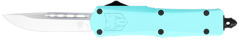 CobraTec FS-3 is a small automatic out-the-front (OTF) knife featuring a 2.75" D2 steel drop point blade and 4.25" mint blue aluminum alloy handle, with an overall length of 7". The knife includes a glass breaker and comes with a nylon sheath, weighing 4.50 oz.