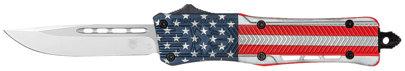 The Cobratec CTK-1 is a compact OTF (out-the-front) folding knife featuring a 2.75" drop point blade made from D2 steel with a plain edge. The handle is constructed from red, white, and blue flag-patterned Cerakote aluminum alloy, with an overall length of 7" when open and a total weight of 4.5 oz. This button-opening knife comes with a nylon sheath for carry and storage.
