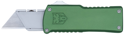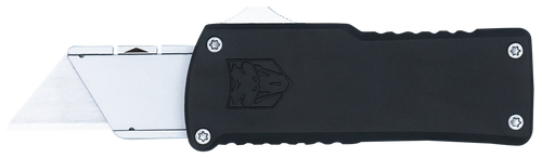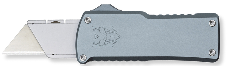 This is an out-of-the-front (OTF) automatic knife with a 1.0" utility blade and 5.13" overall length. The handle is constructed from 6061-T6 aluminum in gray with a replaceable blade design for extended utility and maintenance.