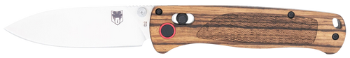 The Cobratec Legacy Bar Lock is a 3-inch folding knife featuring a D2 steel tanto blade with satin finish and zebrawood handle scales. It includes dual thumb studs for ambidextrous opening and a lanyard hole, with an overall length of 7.5 inches when open.