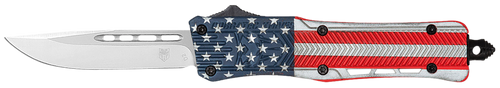 The Cobratec Small CTK1 is an out-of-the-front (OTF) folding knife featuring a 2.75" Wharncliffe blade design. This USA-made knife is finished in red, white, and blue color scheme and is designed for everyday carry and general cutting tasks.