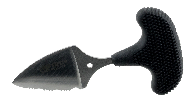 The Cold Steel Mini Pal is a compact fixed blade knife featuring a 1" drop point blade made from AUS-8A stainless steel with 3/4 serrated edge. It has a black synthetic rubber (Kraton) handle and comes with a Secure-Ex sheath with lanyard clip, making it suitable for multi-purpose cutting tasks and everyday carry.