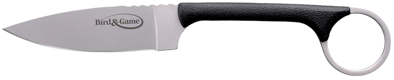 The Cold Steel Bird & Game is a 3.5" fixed blade knife featuring an AUS-8A stainless steel drop point blade with a plain edge. It comes with a black textured polymer handle and includes a Secure-Ex neck sheath with bead chain lanyard, making it suitable for general outdoor and game processing tasks.