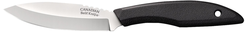 The Cold Steel Canadian Belt is a 4-inch fixed drop point blade knife featuring a cryo-quenched 4116 stainless steel blade with a plain edge. It has a black textured polypropylene handle and comes with a Secure-Ex sheath, weighing 2.20 oz with an overall length of 8.50 inches.