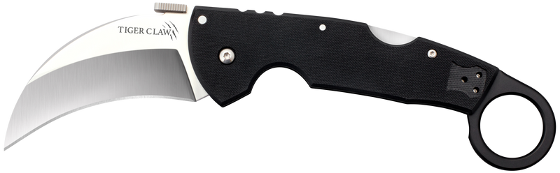 The Cold Steel Tiger Claw is a 9" overall folding knife featuring a 3.50" hawkbill blade made from American S35VN stainless steel with a plain stonewashed finish. The knife includes a matte black G10 handle with ring for improved grip and comes with a belt clip for carry options.
