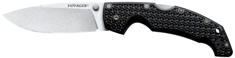 The Cold Steel Voyager Large features a 4" AUS-10A stainless steel drop point blade with a stone washed finish and plain edge. The knife has a black textured Grivex handle with thumb stud opening mechanism and measures 9.25" overall length when open, weighing 5.20 oz.