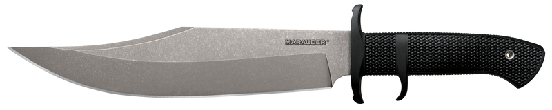 The Cold Steel Marauder features a 9" AUS-8A stainless steel Bowie blade with a plain edge and stone washed finish, paired with a black Kray-Ex handle for durability and grip. This fixed blade knife has an overall length of 14.12" and weighs 12.4 oz, making it suitable for general outdoor use and field tasks. It comes with a Secure-Ex sheath for secure carry and storage.