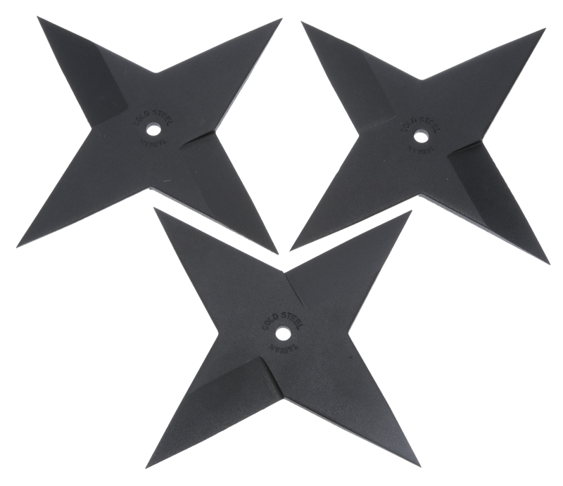 This is a 3-pack of Cold Steel Sure Strike medium throwing stars featuring black epoxy finish carbon steel blades. Each star weighs 4.20 oz and measures 9.3" in length with an 8.1" width. Designed for throwing practice and sport use.