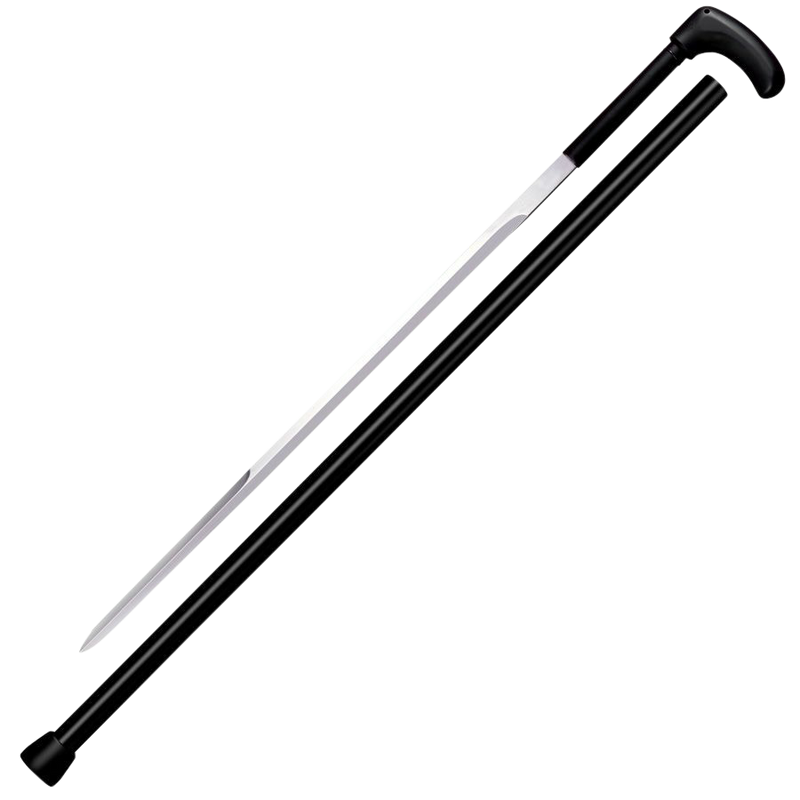 The Cold Steel Sword Cane features a 3Cr13MoV stainless steel blade with a plain edge and a black heavy-duty nylon handle. This 37.5" overall length cane combines a functional walking aid with a concealed blade design. The blade type is sword-style, weighing 26.90 oz total.