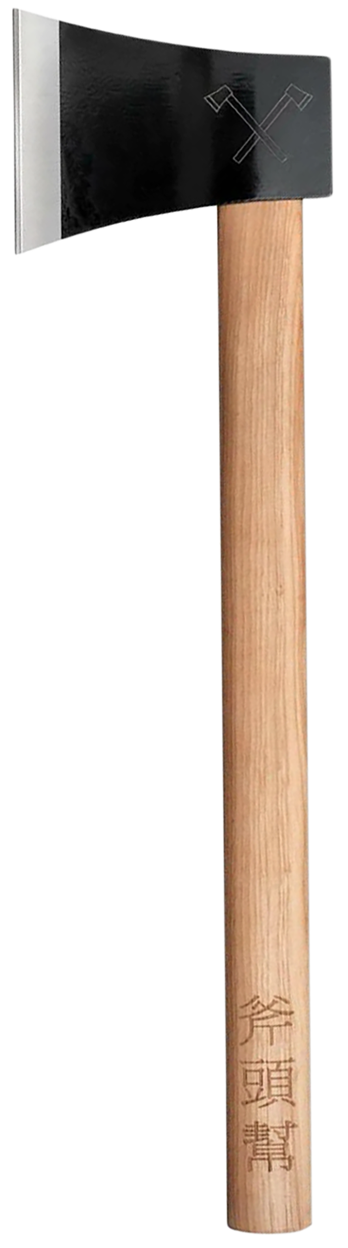 The Cold Steel Axe Gang is a 20.25" hatchet featuring a 4" plain edge blade forged from 1055 carbon steel with a deep forged American hickory handle embellished with kanji characters. This compact hatchet weighs 32 oz and is designed for general chopping, splitting, and outdoor utility tasks. The tool comes in a matte black finish and is packaged in a protective box.