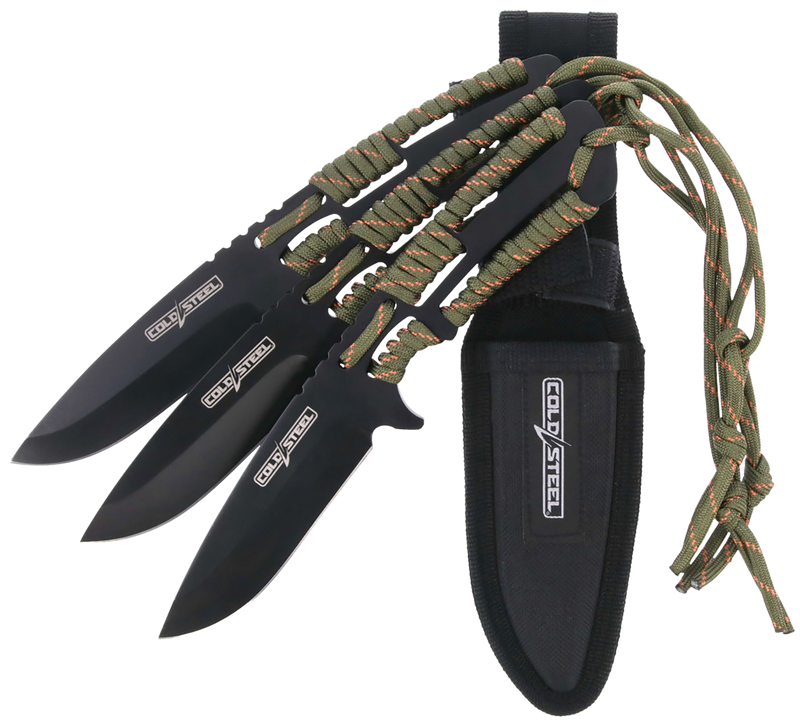 Set of three fixed clip point throwing knives with 4.4" black oxide 420 stainless steel blades and paracord-wrapped handles. Each knife includes a nylon sheath for storage and transport. Designed specifically for throwing practice and sport use.