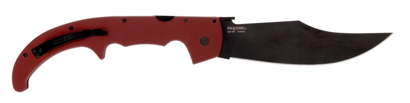 The Cold Steel Espada XL is a large folding knife featuring a 7-1/2" AUS10A stainless steel clip point blade with black oxide finish and a red G10 handle. It employs a Tri-Ad lock mechanism and weighs 14.8 oz with an overall length of 16-3/4", designed as a heavy-duty pocket blade inspired by classical Spanish Navaja knives.