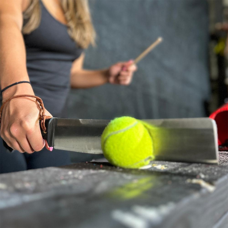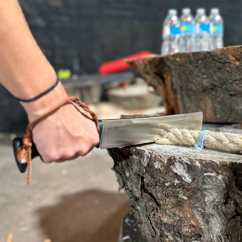 A fixed blade chopper designed for competitive chopping enthusiasts, featuring a 10" cleaver blade made from CPM 3V steel with 8mm thickness for exceptional durability and edge retention. The knife has a 15" overall length with a black Kray-Ex handle and comes with a leather sheath, weighing 28.3 oz for substantial chopping power.