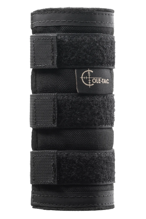 The Cole-TAC HTP102 is a suppressor cover designed to fit 6" suppressors with 1-2" outer diameter. It features an inner tube and outer shell construction that provides heat protection and handling comfort. The cover is available in Coyote Brown and measures approximately 5.9" wide by 2.0" tall.