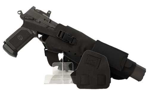 The Cole-TAC Varmint Wrangler is a chest holster designed for .22 LR suppressor host firearms including Ruger MK Series, M&P22, Browning Buckmark, and Taurus TX22, accommodating suppressors and weapon-mounted lights. This right-hand holster features MultiCam Black finish with ModularMolle-compatible design for tactical versatility. Dimensions are approximately 15.7" L x 13.0" W x 1.9" H.
