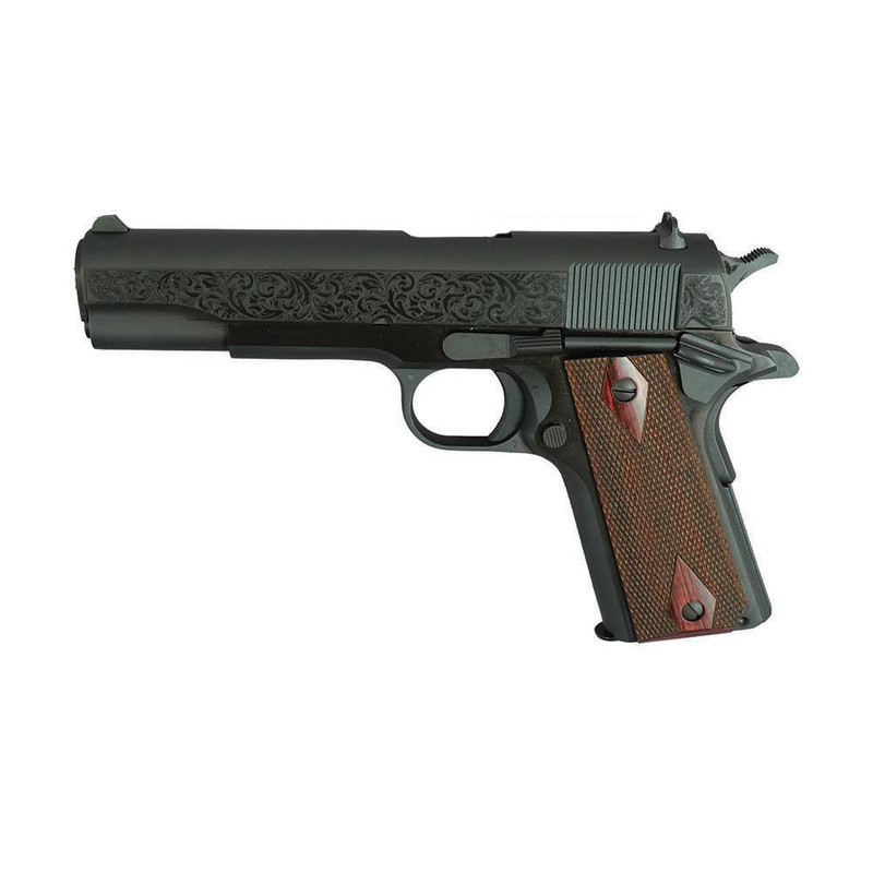 Colt 1911 Government Model semi-automatic pistol chambered in .45 ACP with a 5" barrel and 7-round magazine capacity. Features a black finish with decorative filigree on the frame and barrel. Comes without sights.