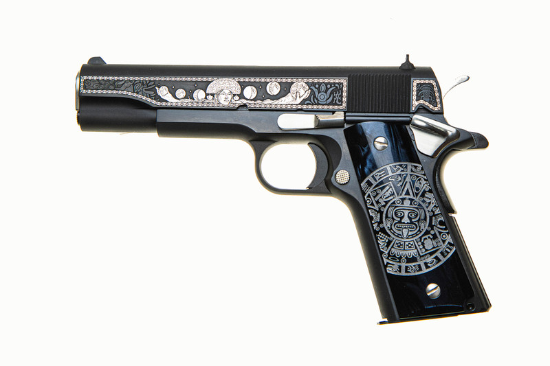This Colt 1911 Government Model is chambered in 38 Super with a 5" barrel and single-action trigger. It features a steel frame with blued finish complemented by gold plating on the slide and hardware, multilevel engraved slide details, and Solar Flare Kirinite Sun Dial grips. With a 9+1 round capacity and combat sights, this 35 oz. pistol delivers classic 1911 performance with distinctive styling.