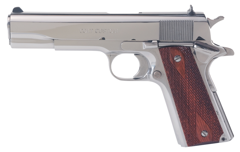 Colt's iconic Government 1911 semi-automatic pistol chambered in 45 ACP with a 5" national match barrel and 7+1 capacity. Features a bright stainless steel finish, serrated slide and frame, beavertail grip safety, and white dot 3-dot sights. Weighs 35 oz with a steel frame and redwood grips.