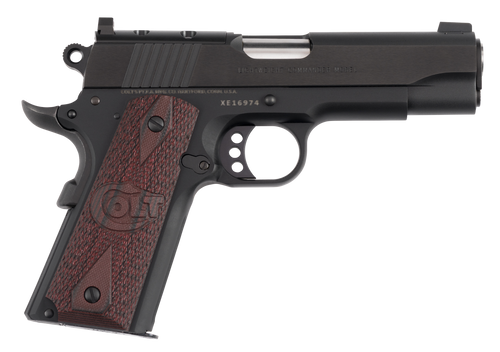 Semi-automatic 1911-style pistol chambered in 45 ACP with a 4.25" National Match barrel and 8+1 capacity. Hand-fit and assembled by Colt Custom Shop Master Gunsmiths with Series 80 firing system, fixed night sights, G10 grips, and Smoked Gray DLC finish for corrosion resistance. Weighs 33 oz with an overall length of 7.75".