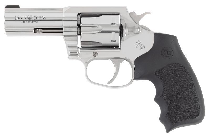 The Colt King Cobra is a double/single-action revolver chambered in 357 Magnum with a 3" stainless steel barrel and 6-round capacity. It features an exposed hammer, fixed brass bead front sight with adjustable rear sight, and black Hogue overmolded grips for enhanced control. This compact revolver weighs 28 oz and measures 8" overall, making it suitable for self-defense and sport shooting.