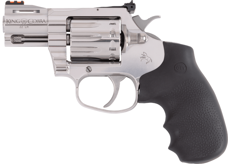 The Colt King Cobra is a double/single action revolver chambered in 22 LR with a 2" stainless steel barrel and 10-round capacity. It features fiber optic front and adjustable rear sights, black Hogue rubber grips, and a stainless steel frame and cylinder. Weighing 28.9 oz with an overall length of 7", this compact revolver is ideal for target shooting, training, and plinking.