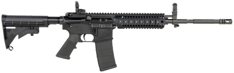 Semi-automatic AR-15 style carbine chambered in 5.56 NATO with a 16.1" government profile barrel and 30+1 capacity. Features a patented monolithic upper receiver with integrated Picatinny rail, A2 flash hider, Magpul MBUS rear sight with integrated flip-up front sight, and 4-position collapsible M4 stock. Weighs 6.79 lbs and includes one magazine.