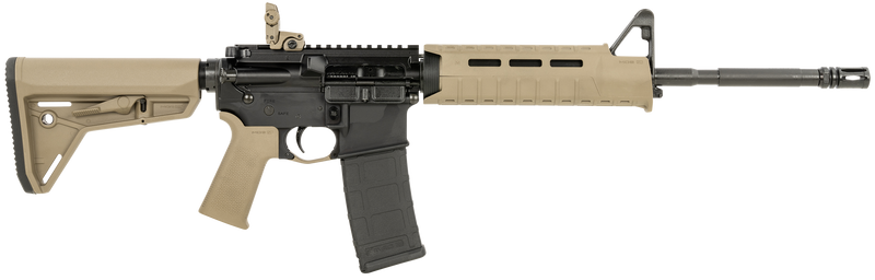 Semi-automatic AR-15 platform carbine chambered in 5.56 NATO with a 16.1" chrome moly vanadium barrel and 1:7" twist rate. Features Flat Dark Earth Magpul MOE Slim Line furniture including adjustable carbine stock, aggressive TSP grip texture, and M-Lok vertical grip; equipped with Magpul MBUS rear sight and A2 front sight. Ships with one 30-round magazine and weighs 6.9 lbs.