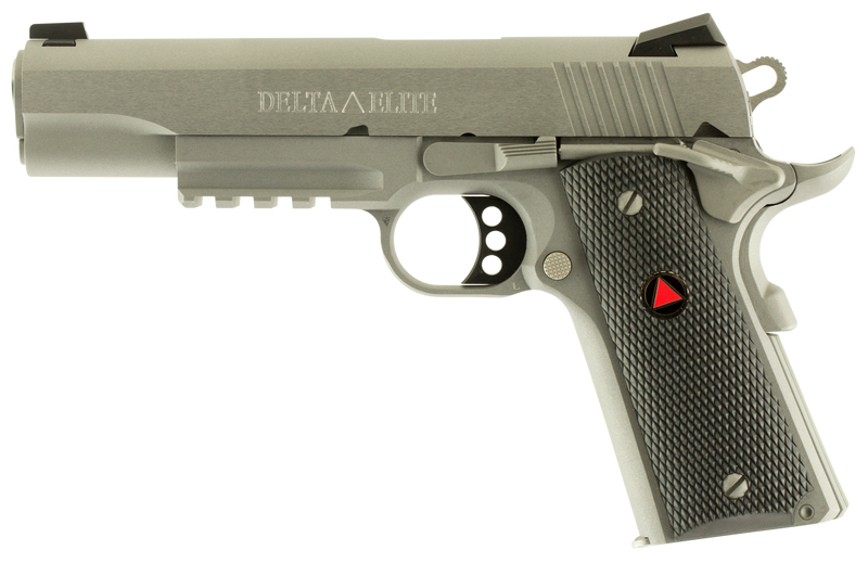The Colt Delta Elite is a single-action semi-automatic 1911-style pistol chambered in 10mm Auto, featuring a 5" stainless steel barrel with a Picatinny rail and stainless steel serrated slide and frame. It comes equipped with Novak White Dot sights, black composite grips with Delta medallions, ambidextrous thumb safety, and weighs 38 oz.