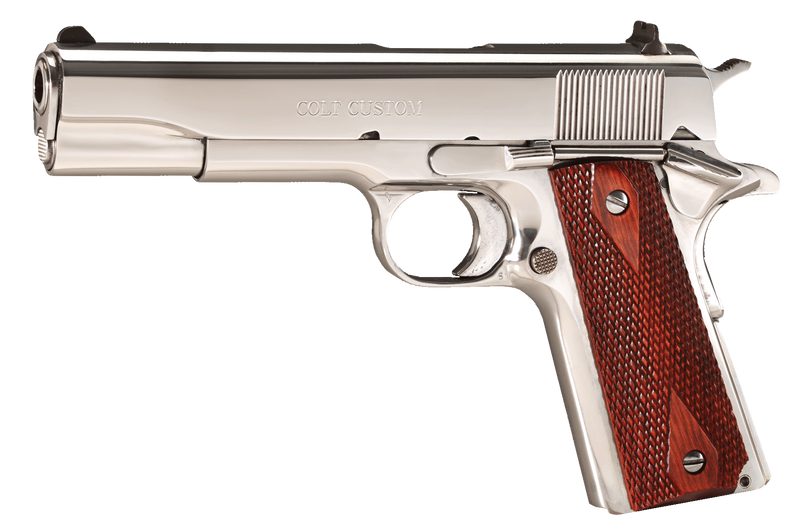 Colt Custom Government semi-automatic pistol chambered in 38 Super with a 5" National Match barrel and 9+1 round capacity. Features high polished stainless steel slide and frame with serrated surfaces, ambidextrous safety, rosewood grips, and 3-dot contrast sights. Weighs 37.50 oz and measures 5" in height, designed for personal protection and sport shooting.
