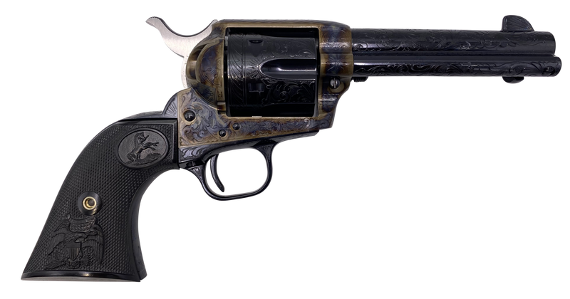 Colt Single Action Army revolver chambered in 45 Colt (LC) with a 4.75" blued engraved barrel and 6-shot capacity. Features a color case hardened engraved steel frame, black polymer grips, and exposed hammer. Overall length is 10.25" with a single-action-only trigger mechanism.