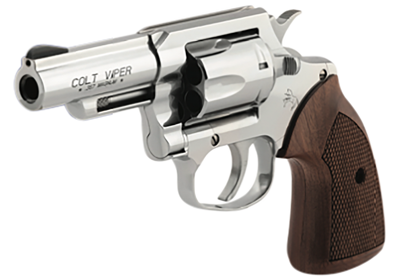 The Colt Viper is a double-action/single-action revolver chambered in .357 Magnum and .38 Special with a 3" stainless steel barrel featuring a half lug design for reduced weight and improved concealability. The forged stainless steel frame and cylinder provide corrosion resistance, paired with American walnut grips and black ramp front/U-notch rear sights. The revolver weighs 26.9 oz with an overall length of 8" and holds 6 rounds.