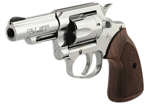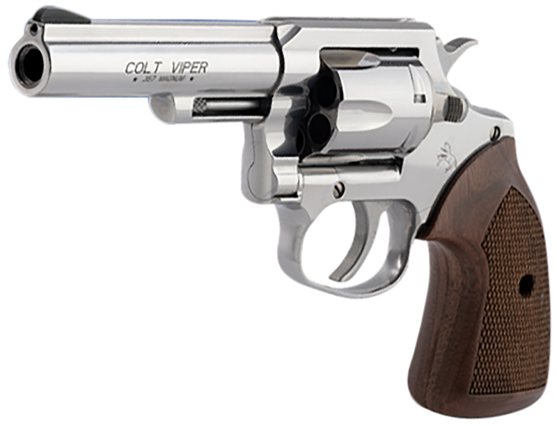 The Colt Viper is a double/single-action revolver chambered in .357 Magnum and .38 Special with a 4.25" half-lug stainless steel barrel and 6-round capacity. It features a stainless steel frame and cylinder, exposed hammer, black ramp front and U-notch rear fixed sights, and American Walnut grips. Weighs 28.5 oz with an overall length of 9.25".