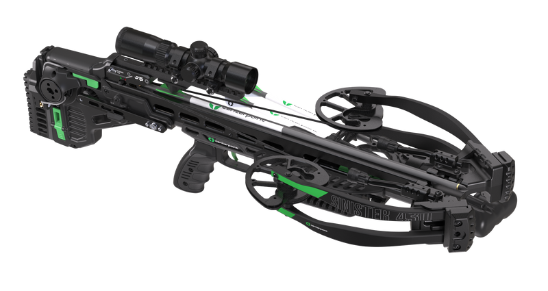 The Sinister 430D is a 2025 crossbow featuring an integrated silent cocking system with auto-retracting cocking sled and de-cocking capability, delivering 430 fps. It includes a 1.5-5x32mm adjustable speed dial illuminated scope and is fully adjustable with bullpup stock, foregrip, string stops, cheek comb, and buttstock for custom fit.