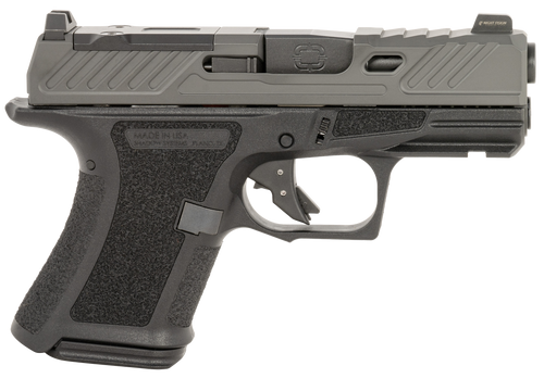 The Shadow Systems CR920 Combat is a 9mm striker-fired semi-auto pistol with a 3.41" barrel and 13+1 capacity. Features an optics-ready combat slide, spiral-fluted black barrel, flat-face aluminum trigger, and night sights (green tritium front, black rear). Weighs 17.8 oz with an overall length of 6.54".
