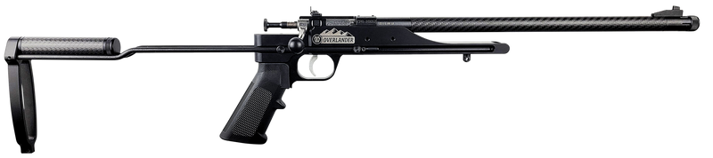 The Chipmunk Crickett 6061 Overlander is a single-shot rimfire rifle chambered in 22 WMR with a 16.125" threaded carbon fiber barrel and 1:16 twist rate. Features include a collapsible/telescoping stock, carbon fiber storage tube, fixed peep sights, and drilled/tapped receiver with 1/2x28 thread pattern. This lightweight precision rifle weighs 3 lbs 8 oz and measures 26.375" to 31.75" overall length.