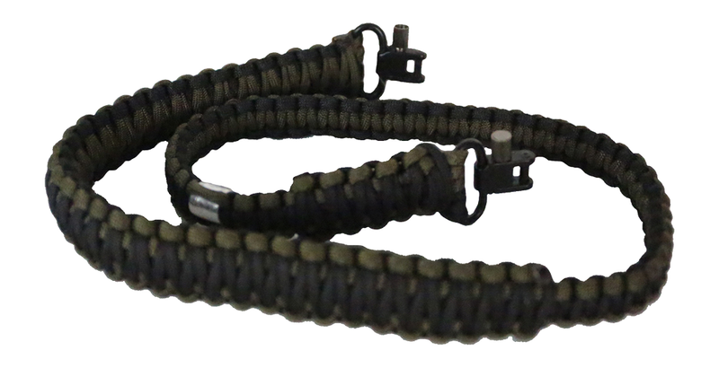 Para-cord sling with integrated swivel attachments designed for firearm mounting and carry. Constructed from durable para-cord material for reliable field use. Dimensions: 10.8" length with 2.8" width.