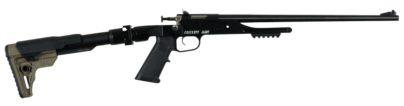 Single shot bolt-action rimfire rifle chambered in .22 LR with a 16.1" blued barrel and hard coat anodized aluminum chassis. Features an adjustable synthetic stock, Picatinny rail for optics mounting, and peep sights. Weighs approximately 3.6-4 lbs and is drilled and tapped for scope mounting, making it ideal for young shooters and small game hunting.