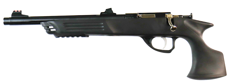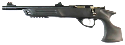 The Crickett KSA693 is a single-shot .22 LR pistol with a 10.5" blued threaded barrel and black synthetic grip. It features Williams fiber optic sights, an integrated Picatinny rail, rebounding firing pin safety, and weighs 2.5 lbs with an overall length of 17.5".