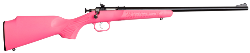 The Crickett KSA2220 is a manually cocking single-shot bolt-action rifle chambered in .22 LR with a 16.125" blued barrel and compact pink synthetic stock designed for youth shooters. Features include a rebounding firing pin safety, adjustable rear peep sight with fixed front sight, drilled and tapped receiver for optics mounting, and includes an EZ Loader, trigger lock, and ear/eye protection. This compact rifle weighs approximately 2.5-3 lbs with an overall length of 30" and 11.5" length of pull, making it ideal for beginners and young marksmen.