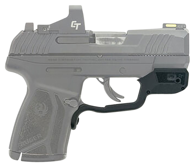 This green laser sight mounts directly to the trigger guard of the Ruger MAX-9, maintaining the pistol's compact profile for concealed carry. Features Crimson Trace's Instinctive Activation technology with a master on/off switch, a 0.50" dot at 50 feet, and operates on a CR1/3N battery. The black polymer housing is user-installable with included tools for windage and elevation adjustment.